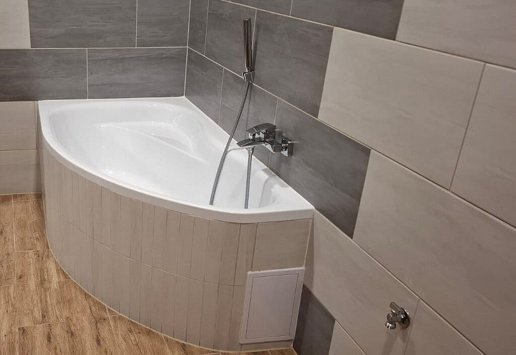 Dominantou bytu je nově rekonstruovaná velká designová koupelna v odstínech světle hnědé, hnědé a šedé, vybavená sprchovým koutem i vanou a samostatnou místností toalety. Dlažba ladí s celkovým stylem koupelny.