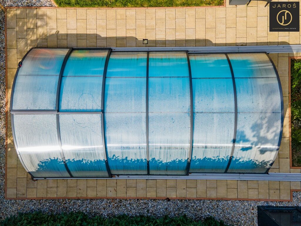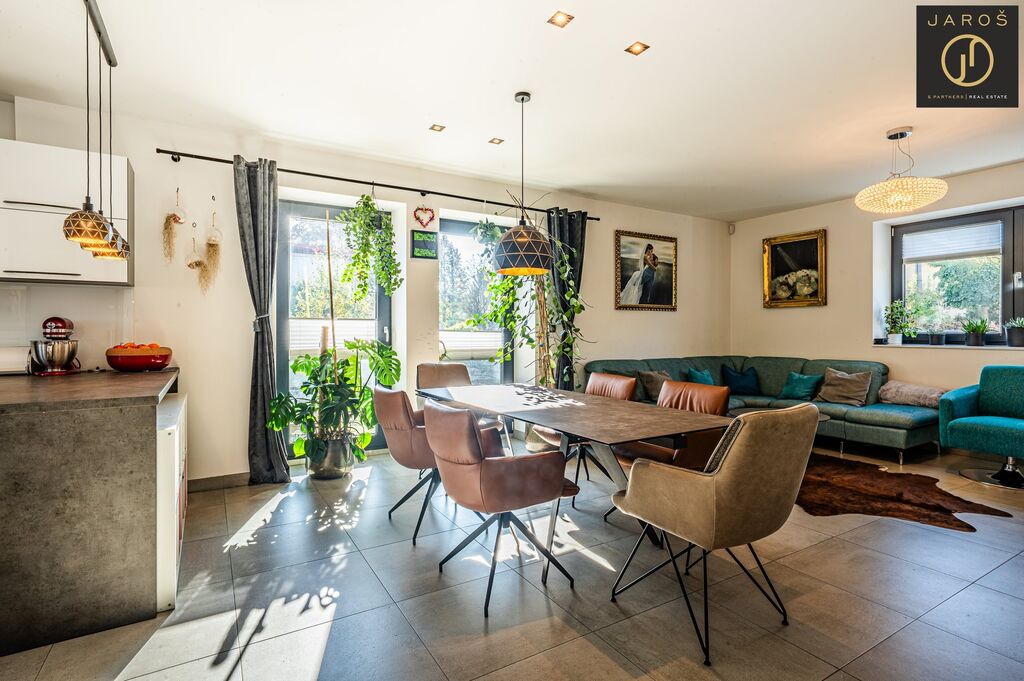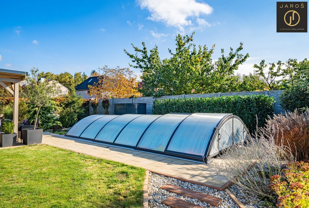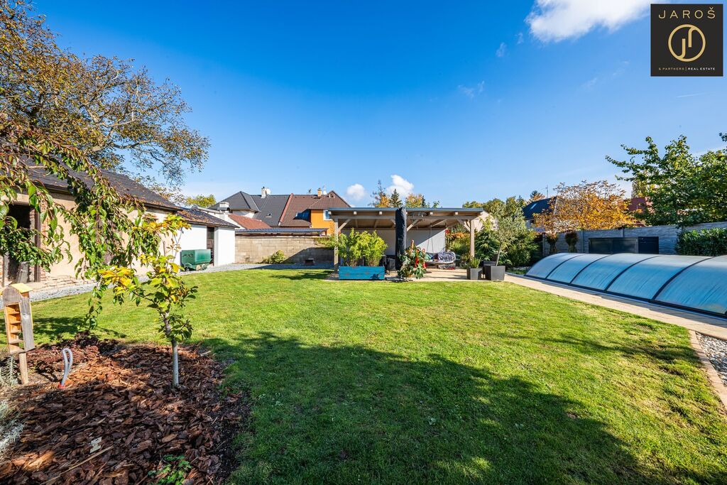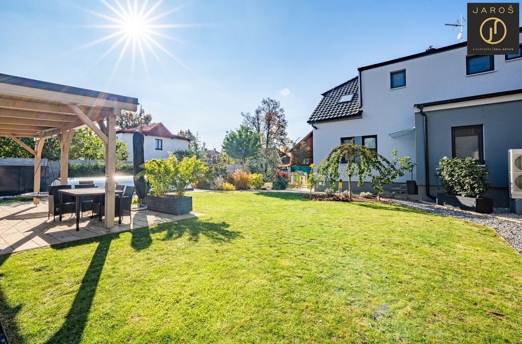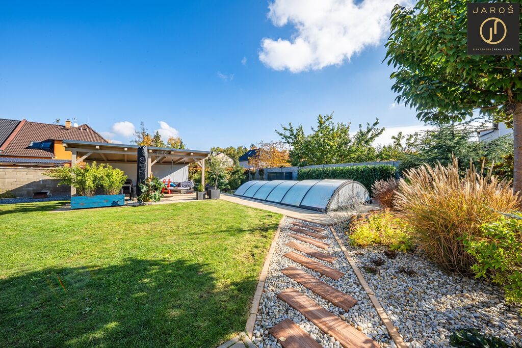 Díky jihozápadní orientaci a velkým oknům je interiér celý den prosvětlený. Na zahradě, která je ideálním místem pro relaxaci se nachází vyhřívaný bazén se slanou vodou a automatickou filtrací, pergola s posezením a grilem. Parkování je možné na zahradě nebo i před domem.
