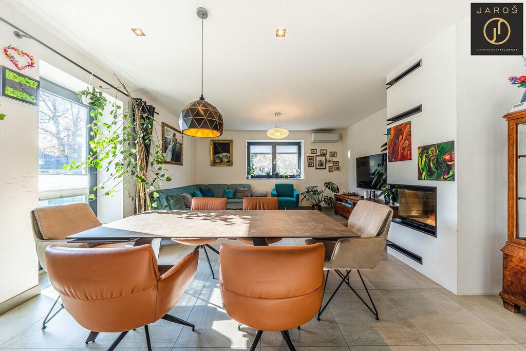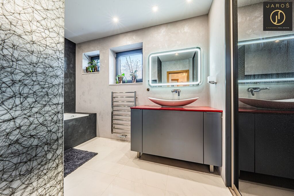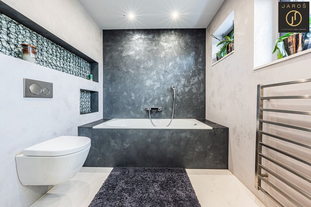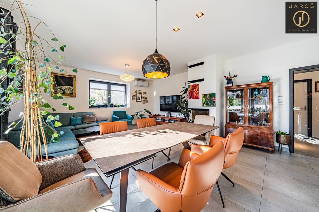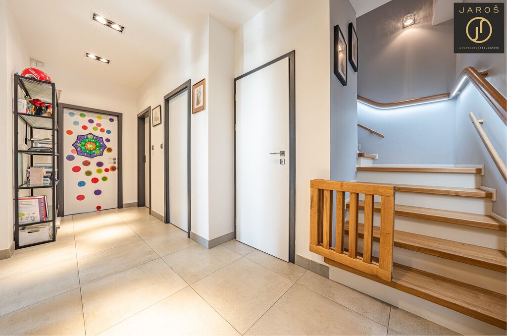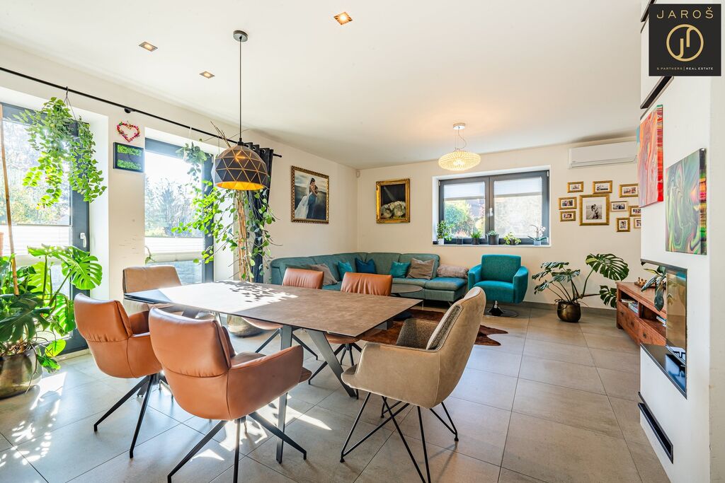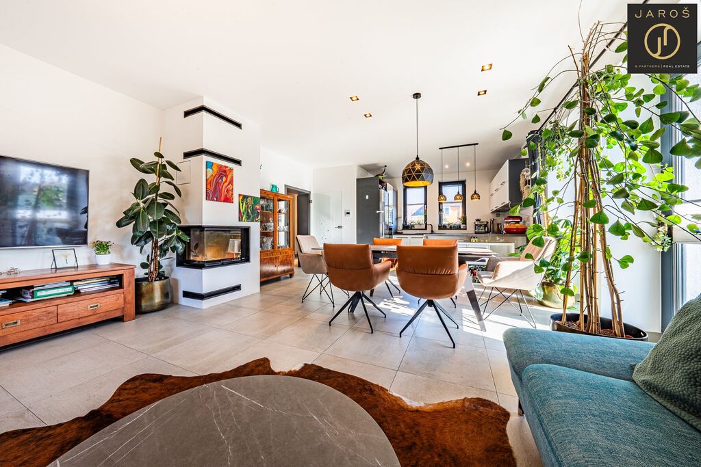 Díky jihozápadní orientaci a velkým oknům je interiér celý den prosvětlený. Na zahradě, která je ideálním místem pro relaxaci se nachází vyhřívaný bazén se slanou vodou a automatickou filtrací, pergola s posezením a grilem. Parkování je možné na zahradě nebo i před domem.
