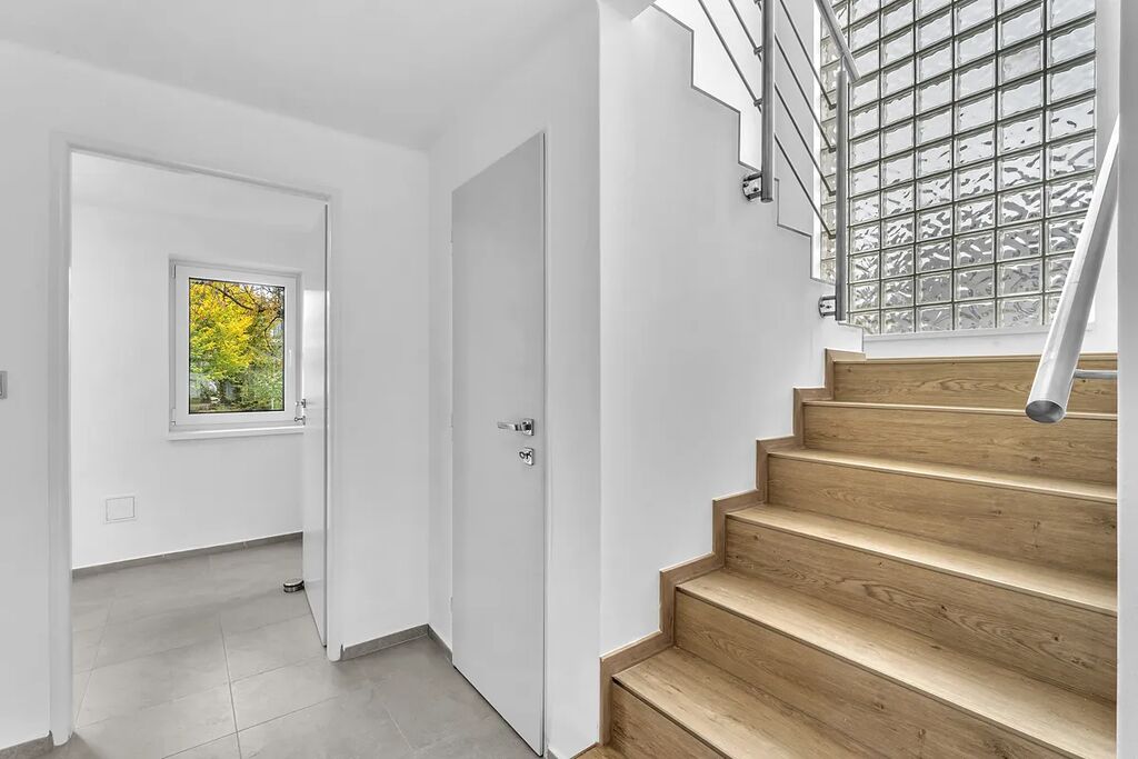 Horní patro nabízí prostorný obývací pokoj s přímým vstupem na terasu, novou kuchyňskou linku s vestavěnými spotřebiči (elektrická trouba, myčka, sklokeramická varná deska), ložnici a další obytné místnosti. Druhá koupelna je vybavena sprchovým koutem.