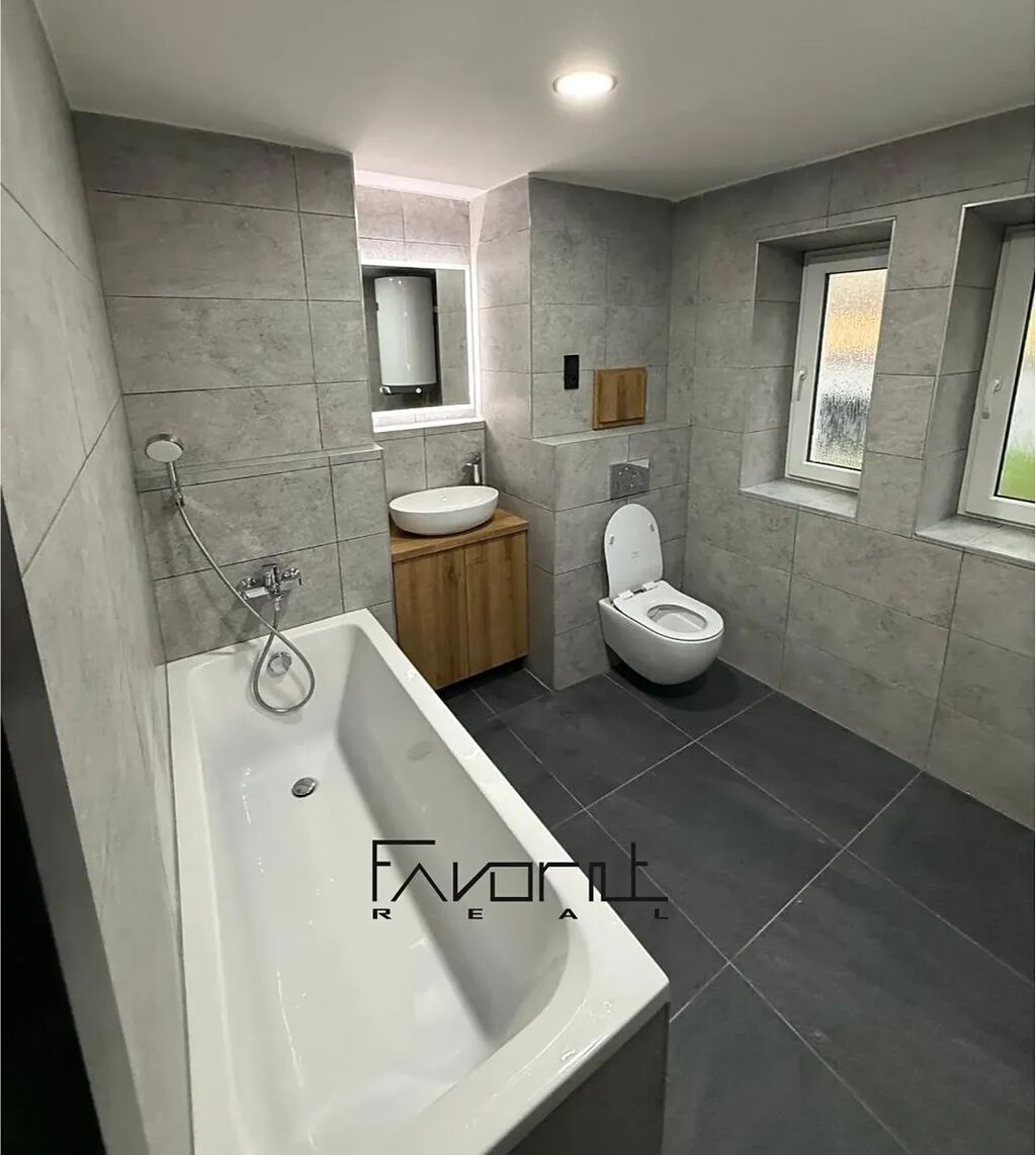 • Koupelna s oknem – nové obklady, dlažba, sanita, baterie, zrcadlo, vana
