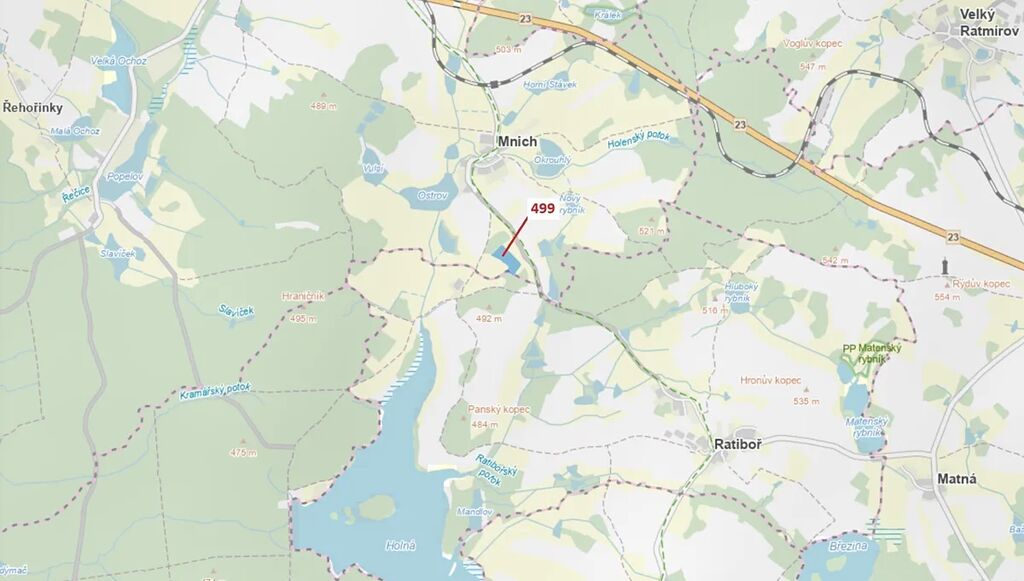 Lesní pozemek o výměře 25 097 m2, parcelní číslo 499, podíl 1/1, katastrální území Mnich u Kardašovy Řečice, obec Kardašova Řečice, obec s rozšířenou působností Jindřichův Hradec, okres Jindřichův Hradec, Jihočeský kraj. Částečně po těžbě.