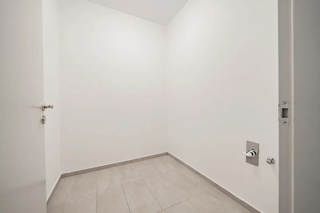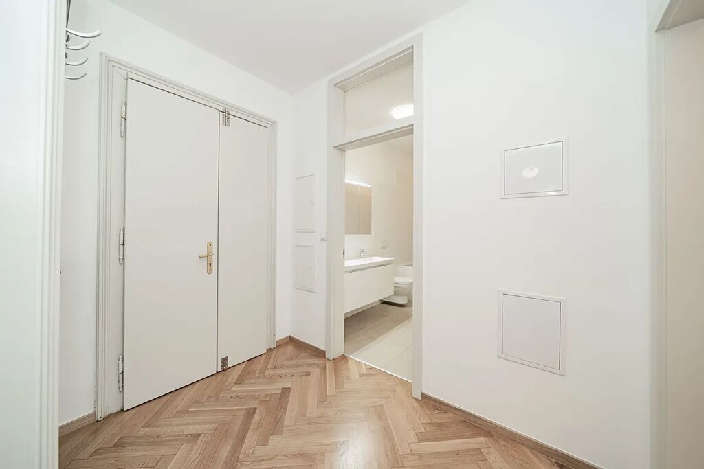 Interiér bytu je nezařízený a dispozice nabízí vstupní předsíň, obývací pokoj s vybaveným kuchyňským koutem, prostornou ložnici, dále koupelnu s vanou a toaletou a velkou komoru s přípojkou na pračku (dle individuální dohody je možné dodat pračku). Kuchyňský kout je vybaven vestavěnými spotřebiči (varná deska, elektrická trouba, myčka, lednice s mrazákem). K bytu náleží sklep.