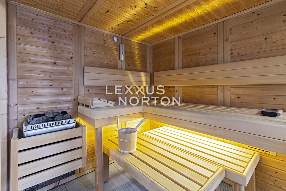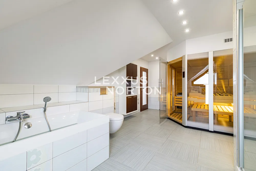 Kuchyňský kout je vybaven sklokeramickou varnou deskou, 2x troubou, americkou lednicí, mrazákem a myčkou nádobí. V koupelně se nachází vana, prosklená sauna a jacuzzi. Součástí vybavení domu je alarm, pračka, sušička, satelit, komora, centrální vysavač, klimatizace a prostorné úložné prostory včetně vestavěných skříní.