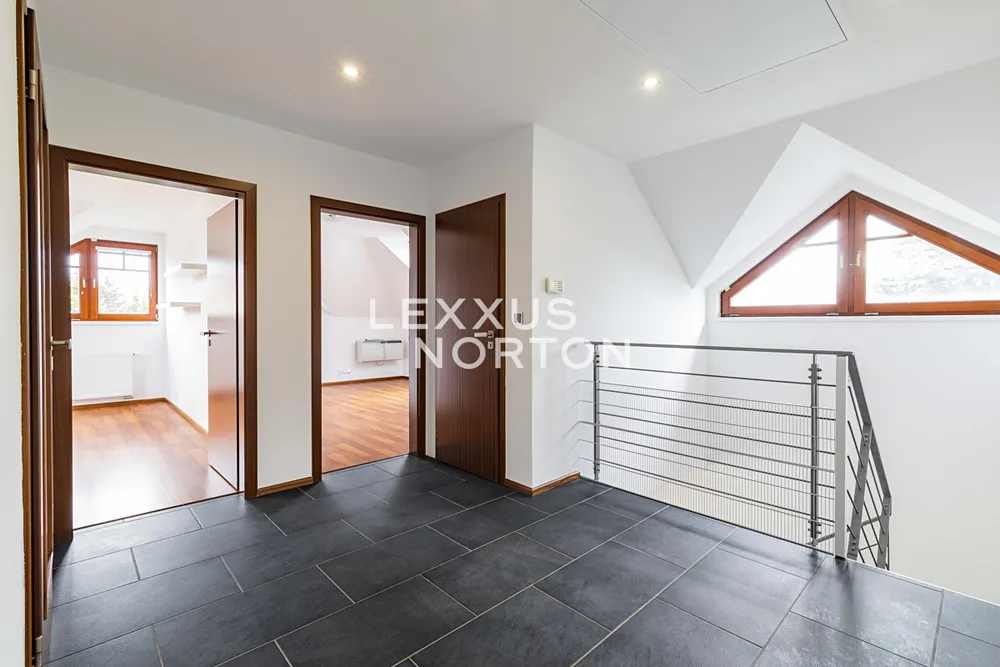 Tento nezařízený rodinný dům k pronájmu sestává ze 2 podlaží. Přízemí domu dispozičně nabízí vstupní chodbu, prostorný obývací pokoj se vstupem na terasu, kuchyňský kout včetně kuchyňského ostrůvku a jídelního prostoru. Dále je na tomto podlaží samostatná toaleta. V prvním patře se nachází 5 ložnic, pracovna a 2 koupelny. Nemovitost je klimatizována. V ceně nájemného je zahrnuta garáž pro 2 vozidla.