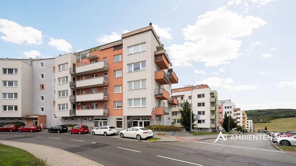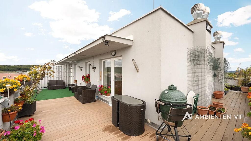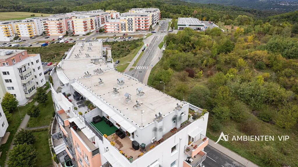 AMBIENTEN VIP si Vám dovoluje nabídnout ve výhradním zastoupení majitele mezonetový byt o dispozici 5+kk s celkovou plochou 112 m², doplněný o terasu 63,1 m², balkon 5,4 m², sklep 4,5 m² a dvě garážová stání, která jsou zahrnuta v ceně. Nemovitost se nachází v žádané a klidné části Brna – Kamechy, Brno–Žebětín, v těsné blízkosti brněnské přehrady a přírodního parku Podkomorské lesy.