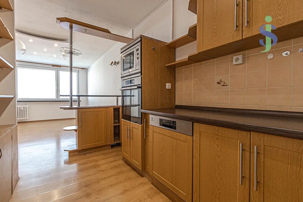 V bytě je kuchyňská linka, včetně el. trouby, plynového sporáku a myčky nádobí.