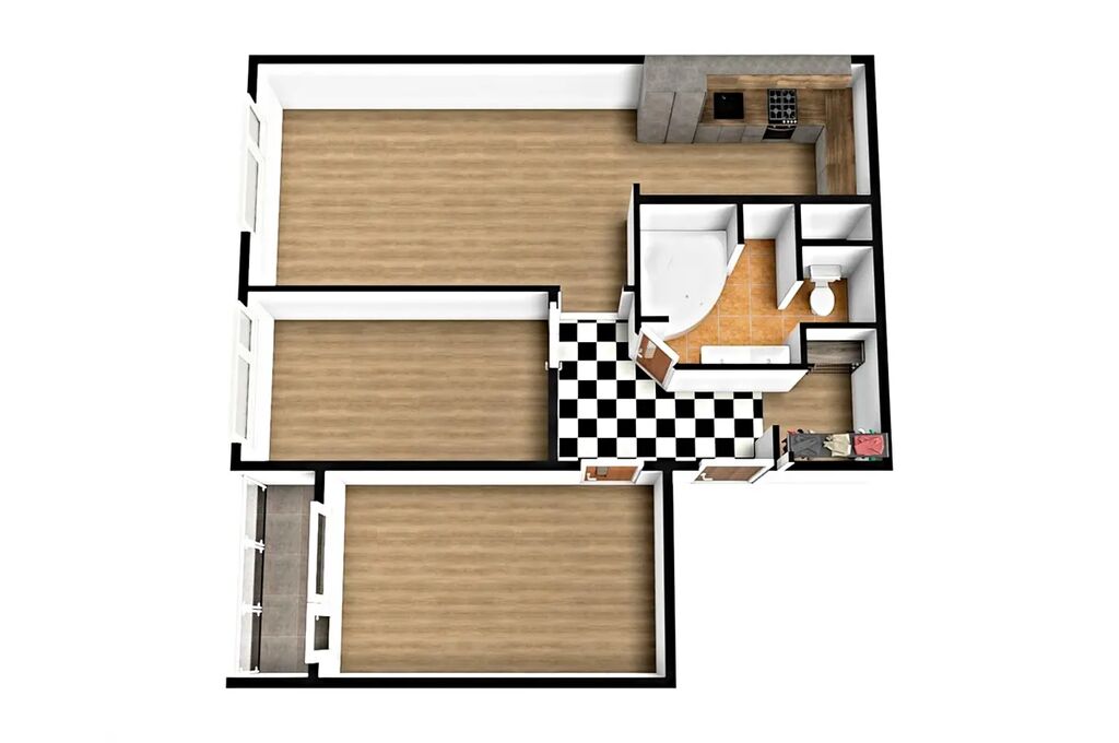 Byt má dvě ložnice a prostorný obývací pokoj s kuchyňským koutem.