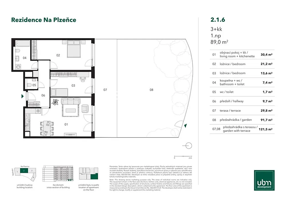 Tento prostorný byt 3+kk s rozlohou 89 m² se nachází v přízemí a nabízí komfortní a praktické bydlení s přímým přístupem na velkou terasu a předzahrádku. Terasa o rozloze přibližně 30 m² a zahrádka o rozloze 92,7 m² vytvářejí ideální prostor pro venkovní aktivity, grilování nebo odpočinek na čerstvém vzduchu. Díky orientaci na jih je byt velmi světlý, slunný a příjemně prosvětlený po celý den. Tento byt je vhodný pro rodiny či jednotlivce, kteří hledají spojení komfortního bydlení s velkým venkovním prostorem přímo u domu.