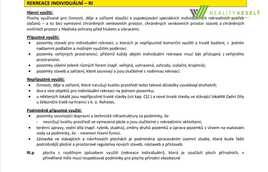 Na pozemku je dle územního plánu možné postavit rekreační objekt o jednom nadzemním podlaží s obytným podkrovím, maximální zastavěná plocha 50 m² – vhodné pro chatu, zahradní domek nebo menší rodinné zázemí pro víkendový pobyt.