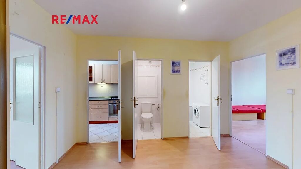 Dispozice je: obývací pokoj s východem do zasklené lodžie + kuchyňský kout, 2 samostatné pokoje, koupelna s vanou, toaleta, šatna, chodba s vestavěnými skříněmi.