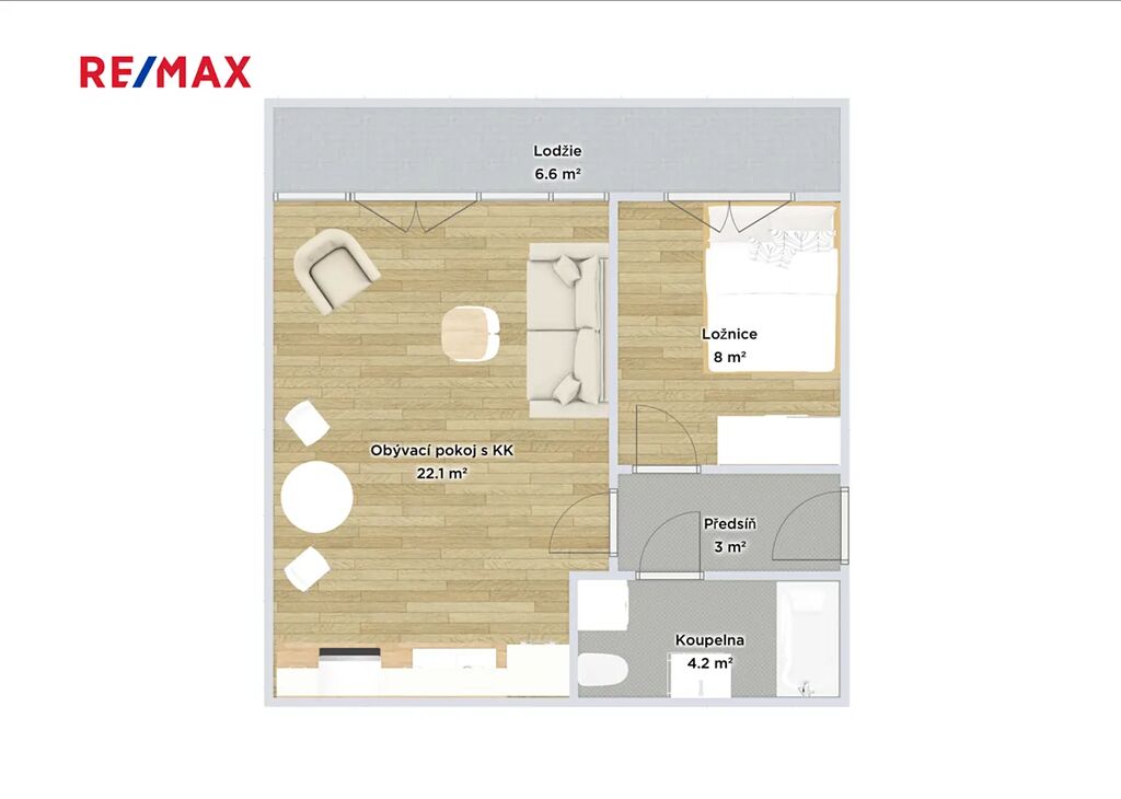 Dispozice bytu zahrnuje obývací pokoj s plně vybaveným kuchyňským koutem, samostatnou ložnici, koupelnu s toaletou a předsíň. Z obývacího pokoje je vstup na lodžii o velikosti 6 m², orientovanou na jihovýchod, která nabízí příjemné posezení a dostatek soukromí díky vzrostlým keřům oddělujícím ulici od lodžie. Lodžie tak působí klidně a útulně, ideálně pro ranní kávu či večerní odpočinek.