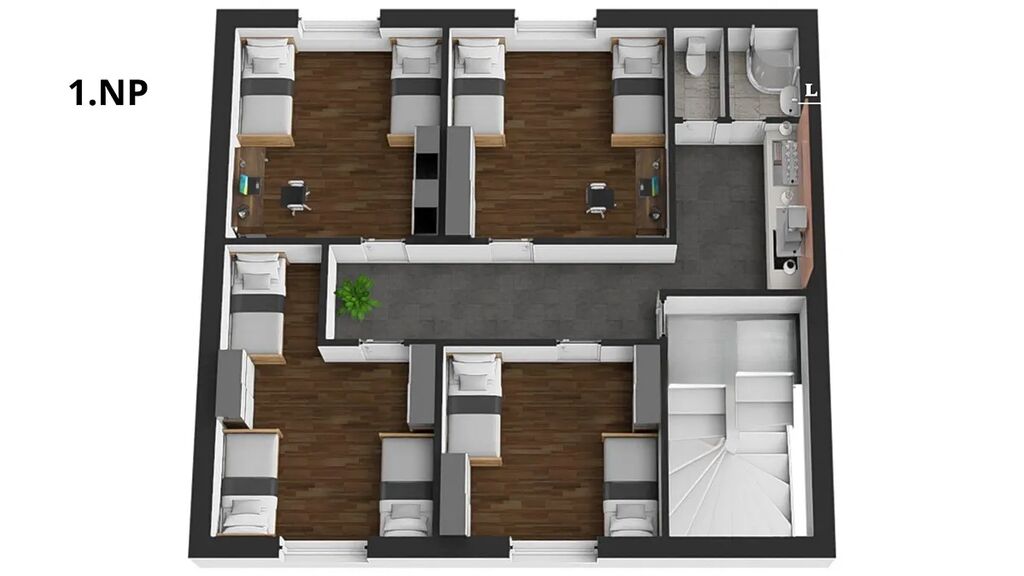 1. a 2. patro: rekonstruované podlaží vhodné pro administrativu, ubytování nebo bytovou jednotku. Každé patro má 98 m2