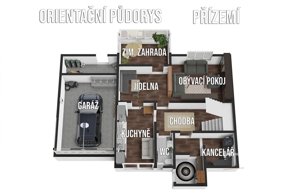 Vyhodou je ideální velikost domu, 2 x garáž u domu, prostorný suterén, zimní zahrada