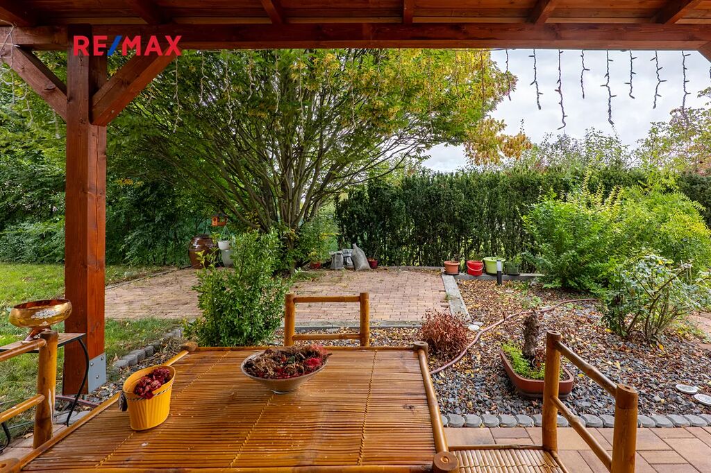 Zahrada s krytou terasou ideální pro rodinné posezení. Součástí je prostor pro bazén a místo pro dětské hry.