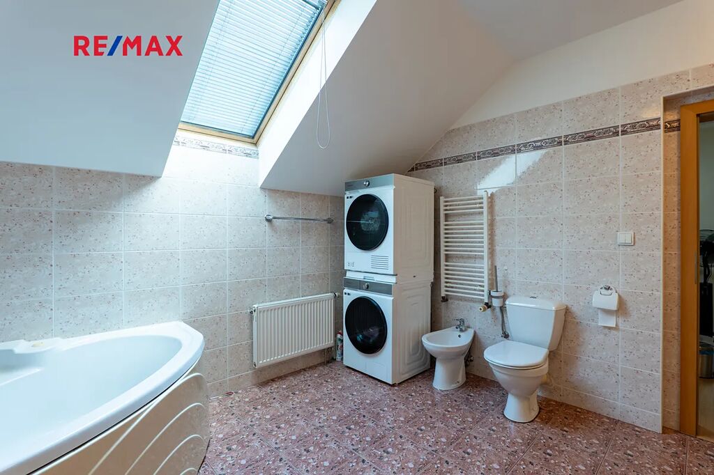 V patře je koupelna se saunou, rohovou vanou i sprchovým koutem a finskou saunou. Nachází se zde také pračka a sušička. Celková plocha koupelny je 17,48 m².