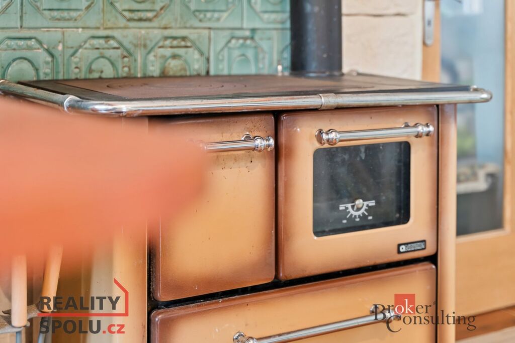 Vytápění zajišťuje ústřední topení s elektrokotlem a krbová kamna, která jsou v přízemí i v podkroví – dům se dá tak bez problémů vytopit i bez elektřiny.