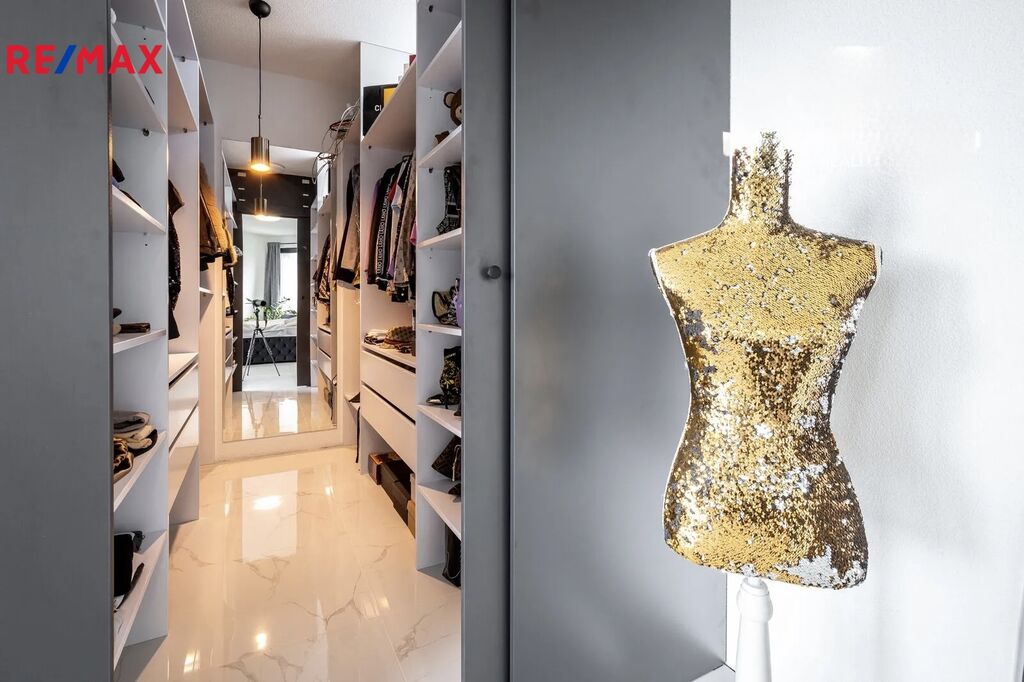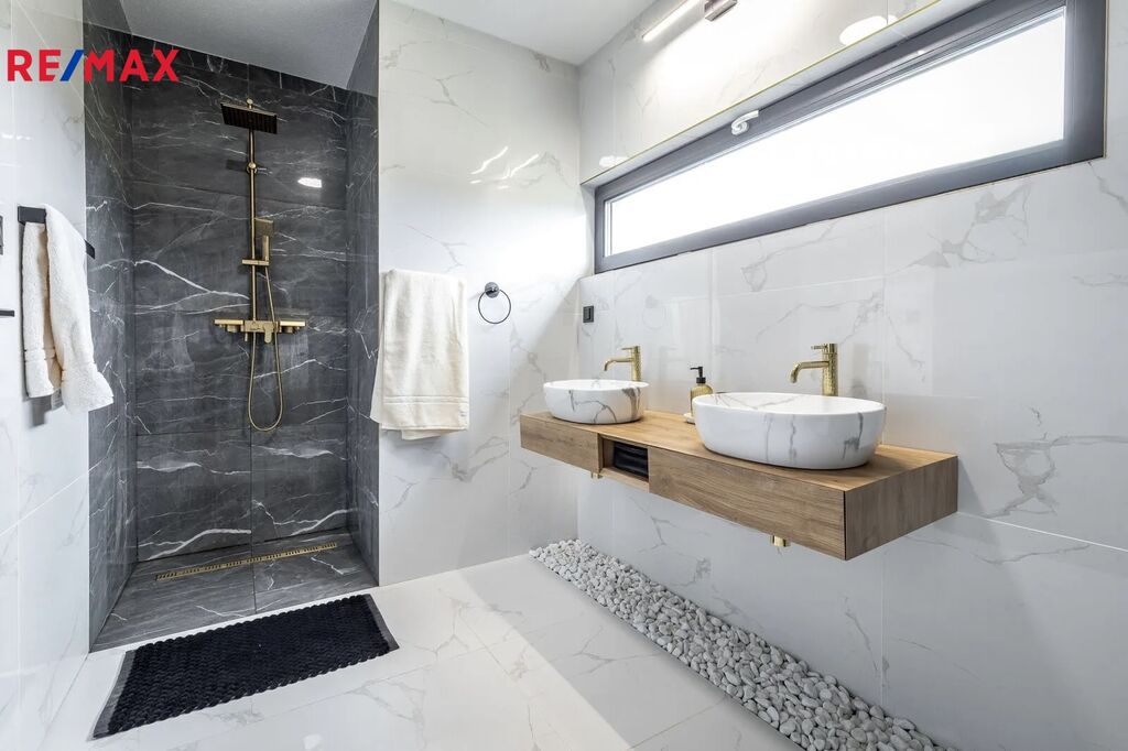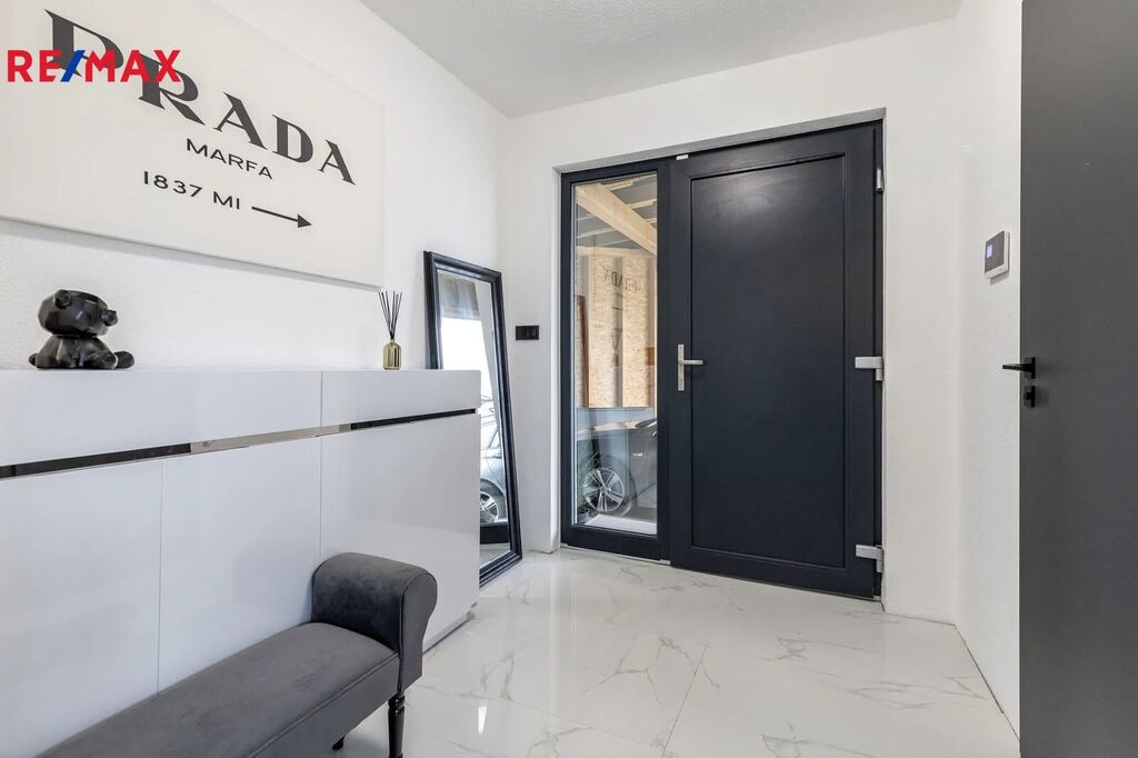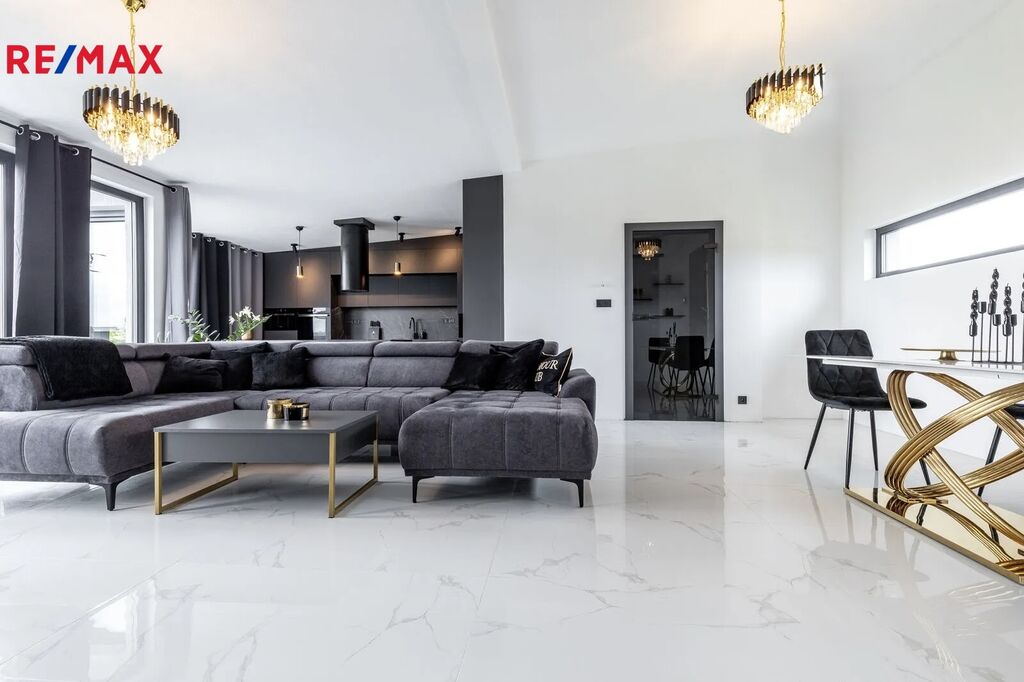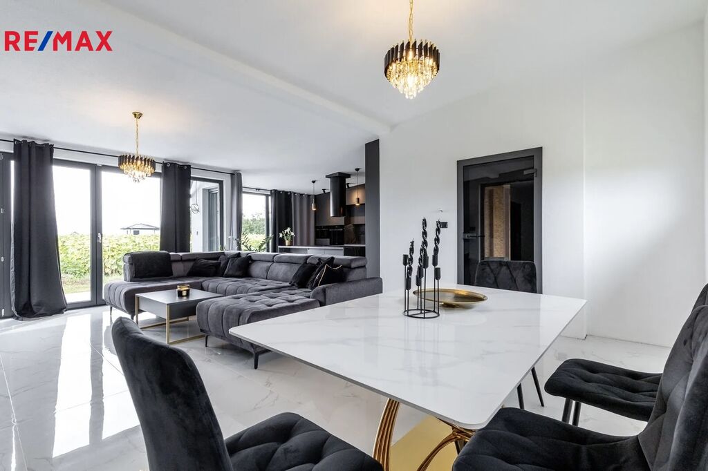 Interiér domu byl navržen s důrazem na kvalitu, design a funkčnost. Každý detail, od nábytku na míru po kvalitní spotřebiče, podtrhuje vysoký standard bydlení. Prostorný obývací pokoj s kuchyní a jídelnou tvoří srdce domu a nabízí vzdušný, reprezentativní prostor pro rodinný život i společenské setkávání.