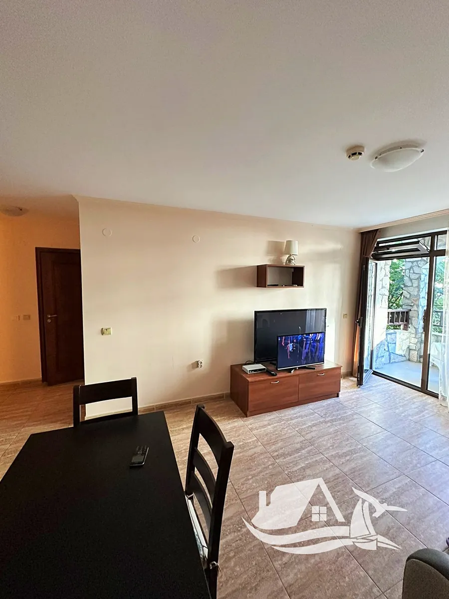 Apartmán o rozloze 68 m² se nachází v přízemí a nabízí praktickou dispozici: prostorný obývací pokoj s kuchyňským koutem, samostatnou ložnici, koupelnu s toaletou, vstupní chodbu a terasu s výhledem do klidné části areálu. Je plně vybavený – připravený k okamžitému bydlení či pronájmu. Stav nemovitosti je velmi dobrý, interiér působí útulně a přirozeně.