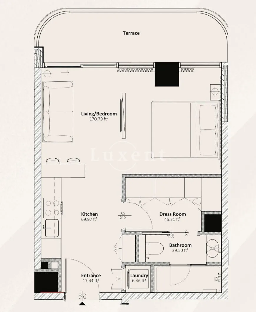 Nabízíme k prodeji studio o velikosti 45 m² s walk-in šatnou, koupelnou a balkonem s výhledem do zahrady v exkluzivní rezidenci Livel Residenza, kde se italská elegance snoubí s moderním životním stylem Dubaje. Interiér bytu je navržen s důrazem na pohodlí a funkčnost, kombinuje inteligentní úložná řešení, prostorné obytné zóny a spa-like koupelnu, a každý detail reflektuje precizní řemeslnou práci a nadčasový design.