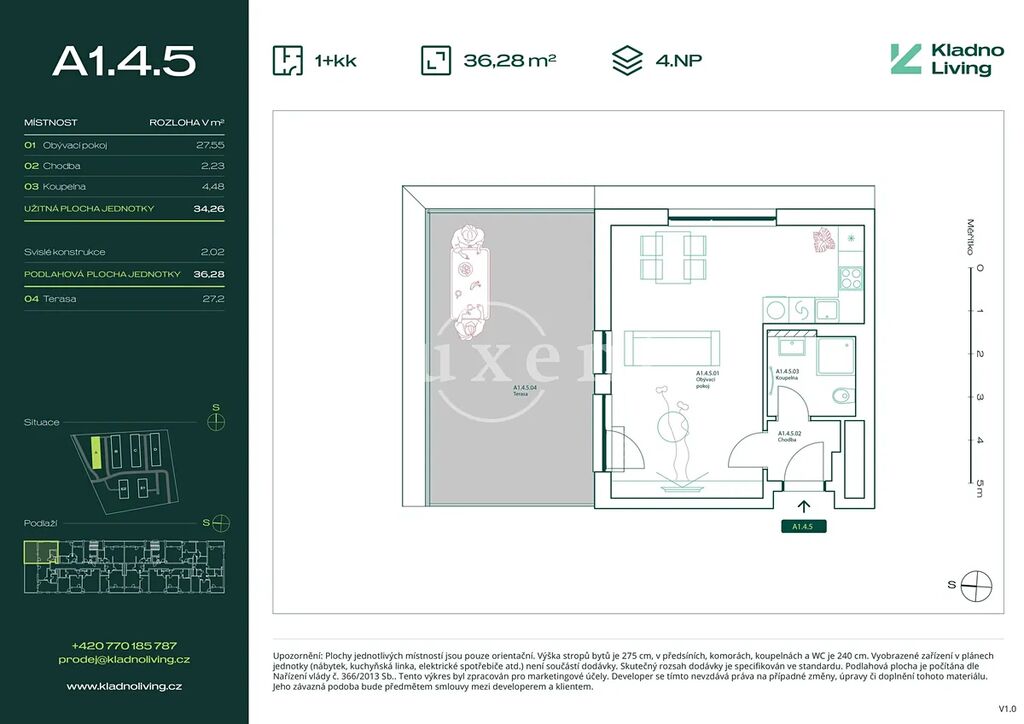 Nabízíme ke koupi moderní byt 1+kk o podlahové ploše 36,3 m² s terasou 27,2 m² v rezidenčním projektu Kladno Living, který vzniká v jedné z nejatraktivnějších lokalit města Kladno – Kročehlavy. Tento nový developerský projekt představuje jedinečnou příležitost pro ty, kteří hledají nové byty v Kladně nebo investici do nemovitosti s vysokým potenciálem zhodnocení.