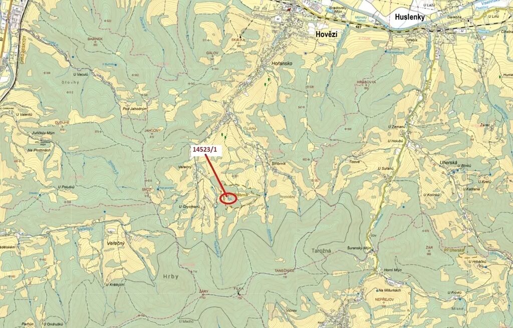 Lesní pozemek o výměře 1547 m2, parcelní číslo 14523/1, podíl 1/1, katastrální území Hovězí, obec Hovězí, obec s rozšířenou působností Vsetín, okres Vsetín, Zlínský kraj.