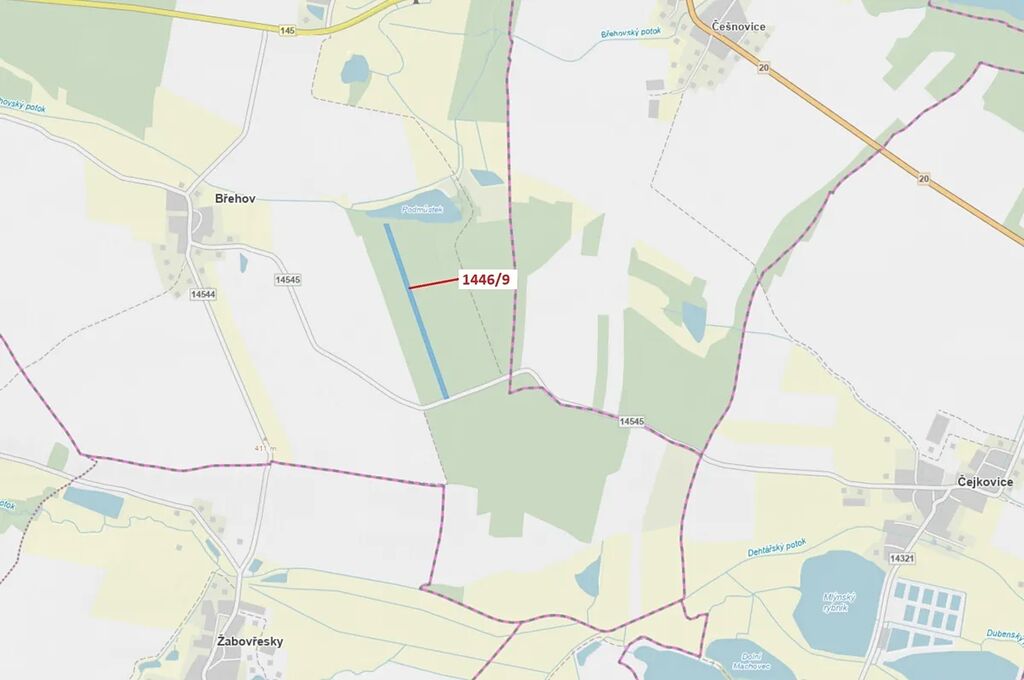 Lesní pozemek o výměře 19 879 m2, parcelní číslo 1446/9, podíl 1/1, katastrální území Břehov, obec Břehov, obec s rozšířenou působností České Budějovice, okres České Budějovice, Jihočeský kraj. Po těžbě.