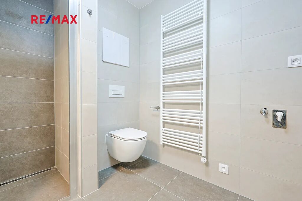 Byt je vytápěn moderním podlahovým topením, přičemž celý dům využívá úsporné tepelné čerpadlo.