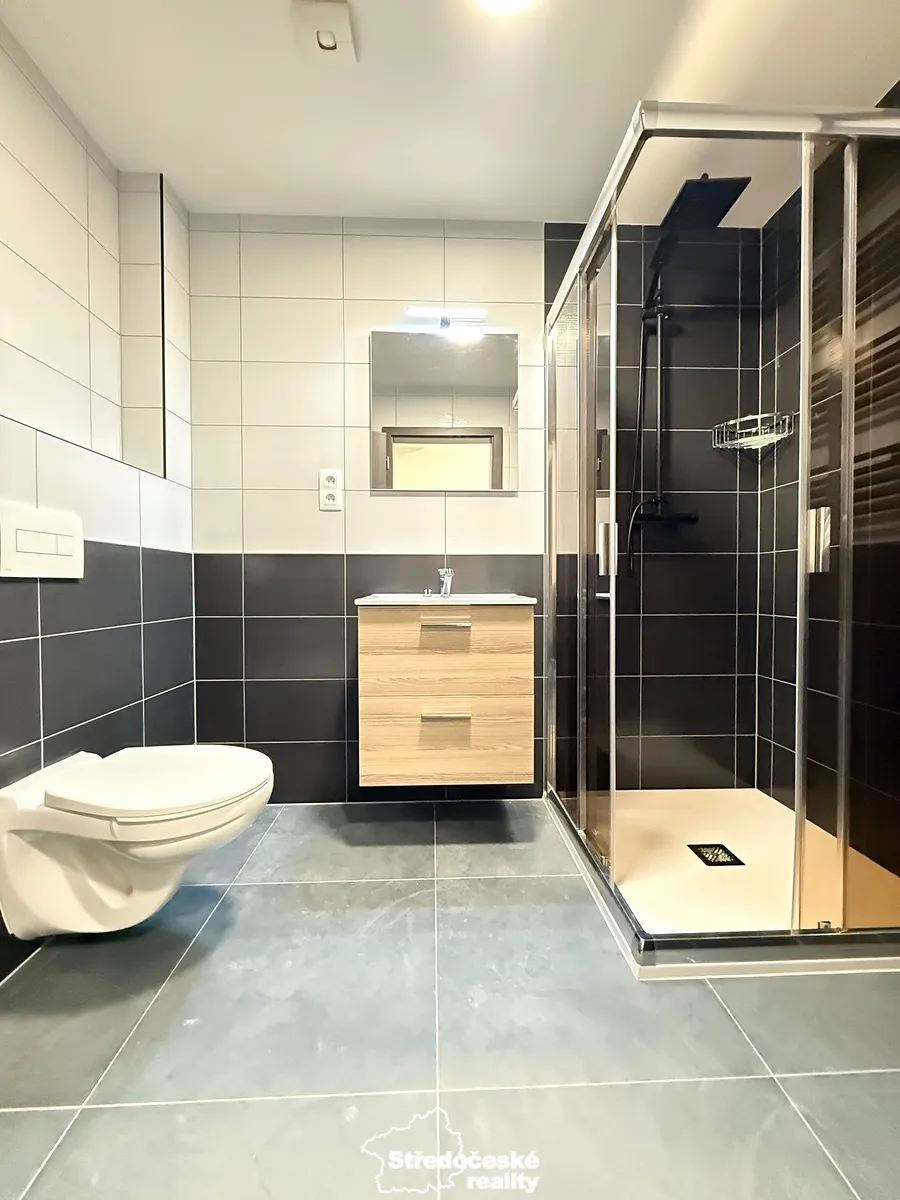 Po vstupu do bytu se nachází chodba. Po pravé straně je koupelna se sprchovým koutem, WC a přípravou pro pračku. Dále následuje obývací pokoj s kuchyňským koutem o výměře 21,2 m², vybavený novou kuchyňskou linkou a základními spotřebiči: myčkou, varnou deskou, vestavěnou elektrickou troubou, digestoří a mikrovlnkou. Z obývací části je přímý vstup na terasu a zahradu (oplocení plánováno na jaro 2026).