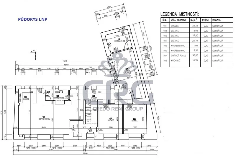 Celková plocha nemovitosti činí 1.480 m2, z toho zastavěná plocha a nádvoří je dle Listu vlastnictví 702 m2 a zahrada má výměru 778 m2. V přízemí se nachází bytová jednotka o dispozici 4+KK se dvěma koupelnami o výměře cca 165,40 m2. V podkroví se nachází nedokončená bytová jednotka o dispozici 2+kk se dvěma půdami o výměře cca 152,90 m2. Z toho samostatná jednotka má výměru cca 53,90m2 a obě půdy o celkové výměře cca 99 m2.