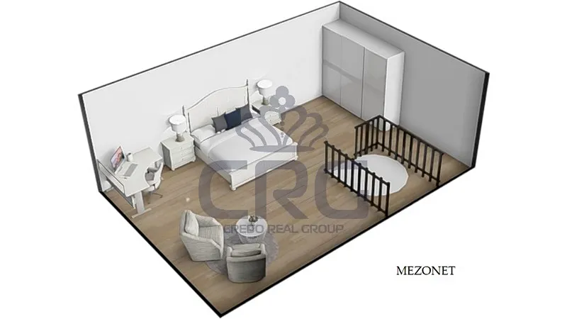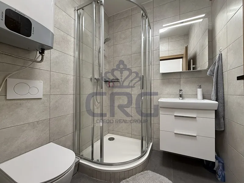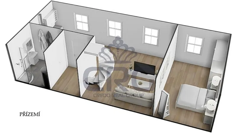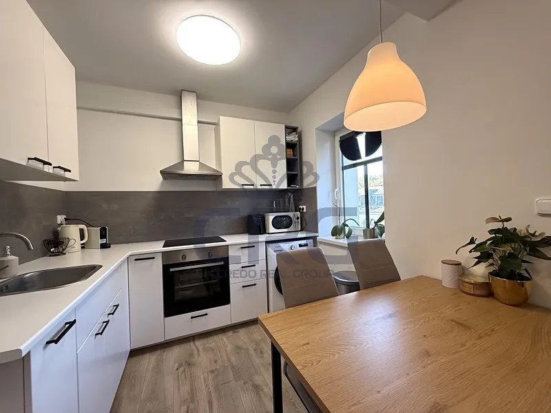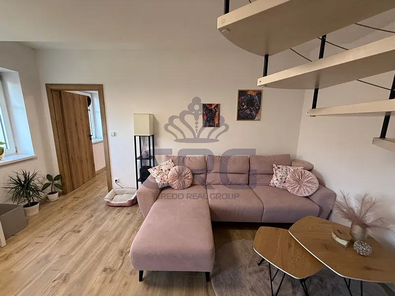 Za vchodovými dveřmi se ocitneme v prostorné chodbě (cca 3,14 m2), ze které je vstup do velké koupelny (cca 2,65 m2). Koupelna s WC je vybavena umyvadlovou skříňkou, umyvadlem, velkým zrcadlem, WC a sprchovým koutem. Hlavní dominantou bytu je pokoj s kuchyňským koutem (cca 24,10 m2), který disponuje novou kuchyňskou linkou, jejíž součástí je digestoř, elektrická trouba, elektrická sklo-keramická deska a pračka. Lednička s mrazákem zde není, ale majitel v případě zájmu lednicí s mrazákem byt dovybaví. V tomto pokoji je také široké točité schodiště vedoucí do mezonetu, kde je pokoj (galerie) o výměře (cca 21,39 m2) s přiznanými trámy a střešním oknem. V místnosti je klimatizace značky LG, která chladí i vytápí. V přízemí nesmíme opomenout ani další samostatný pokoj (cca 13,21 m2), který může sloužit jako obývací, ale i jako ložnice.