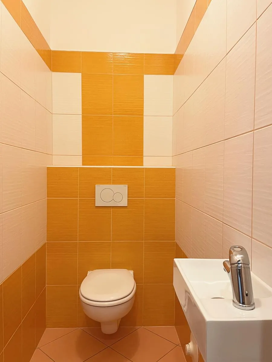 Koupelna s vanou, sprchovým koutem a toaletou působí vzdušně a protože byt nabízí i druhou samostatnou toaletu, nebudete si nikdy překážet ideální, pokud bydlíte ve dvou.