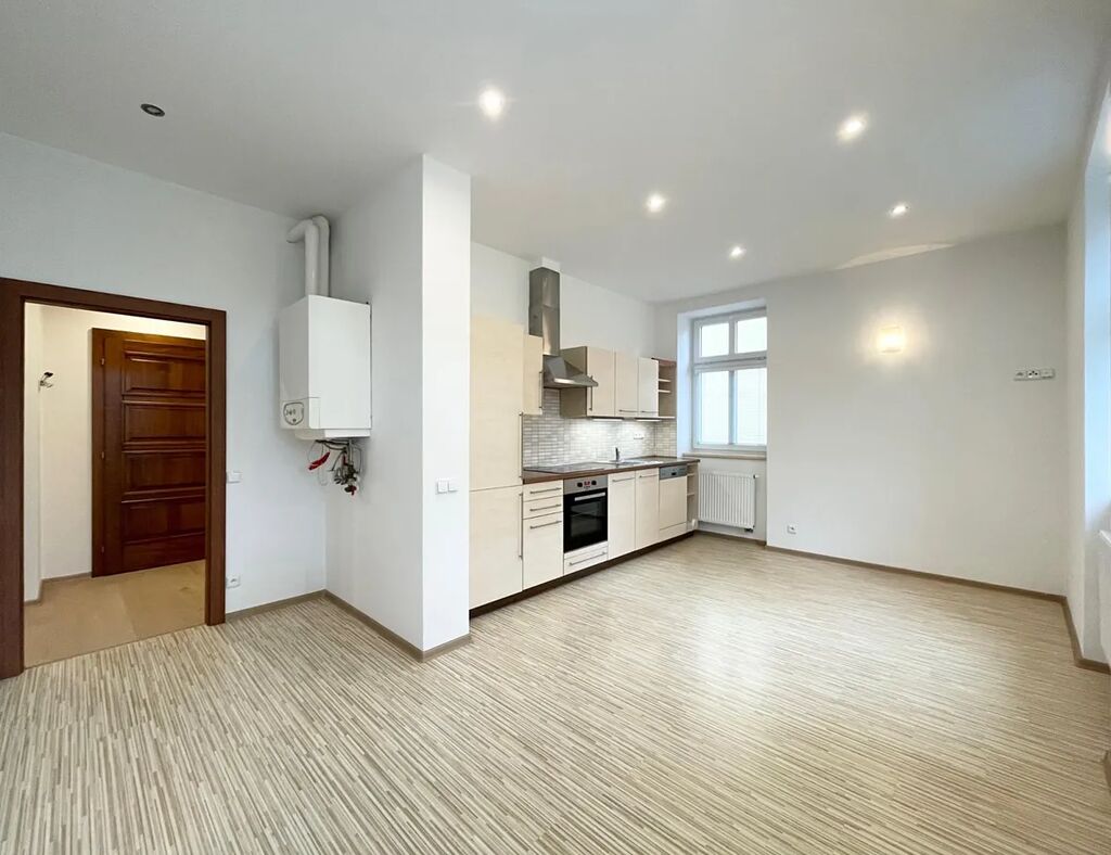 Srdcem bytu je prostorná kuchyň s moderní linkou a všemi spotřebiči (myčka, lednice s mrazákem, trouba, varná deska, mikrovlnná trouba). Je tady dostatek místa pro velký jídelní stůl, pracovní kout nebo i menší gauč, kde se dá odpočívat s kávou nebo knížkou.