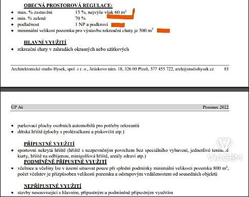Pozemek je dle územního plánu veden jako RI.1 Konkrétně RI.1 - Rekreace individuální - chatové osady. Dle regulace v příloze lze na pozemcích vystavět až dvoupatrové chaty s nejvýše 60m2 zastavěné plochy.