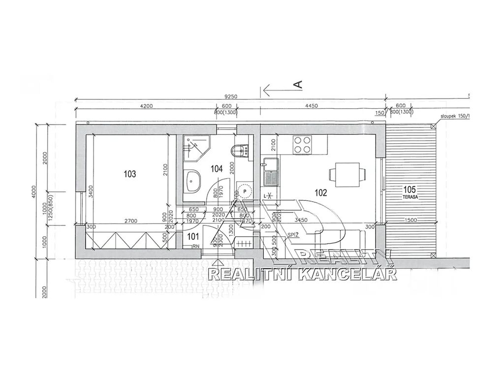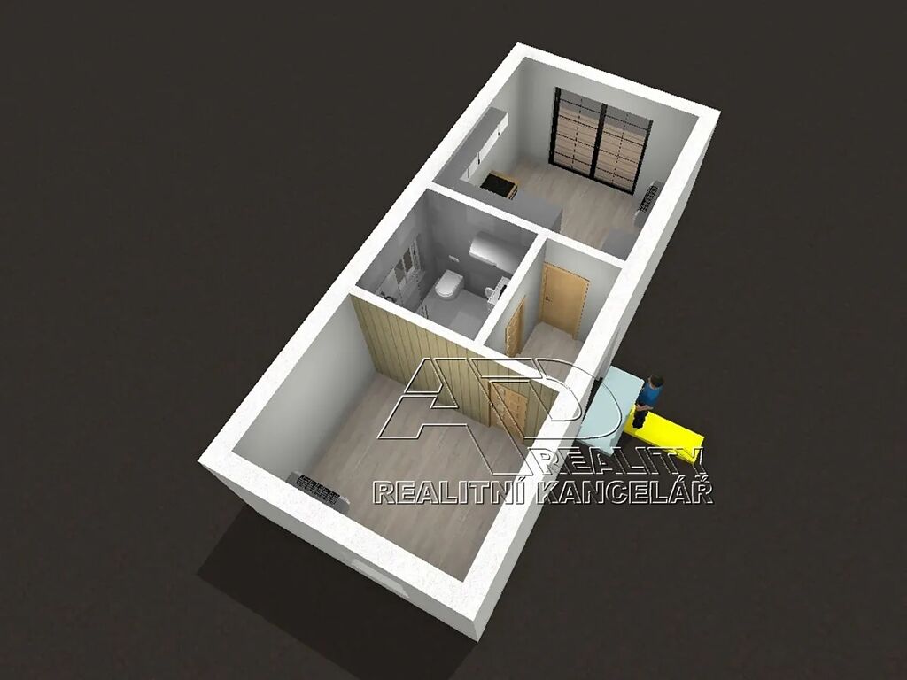 Dispozice: předsíň [3.1m2], obytná kuchyně [12m2] s přístupem na terasu, ložnice / pokoj [9.2m2] a koupelna/WC [3.8m2]. Orientace obýváku / terasy na jih do zahrady, ložnice na sever.