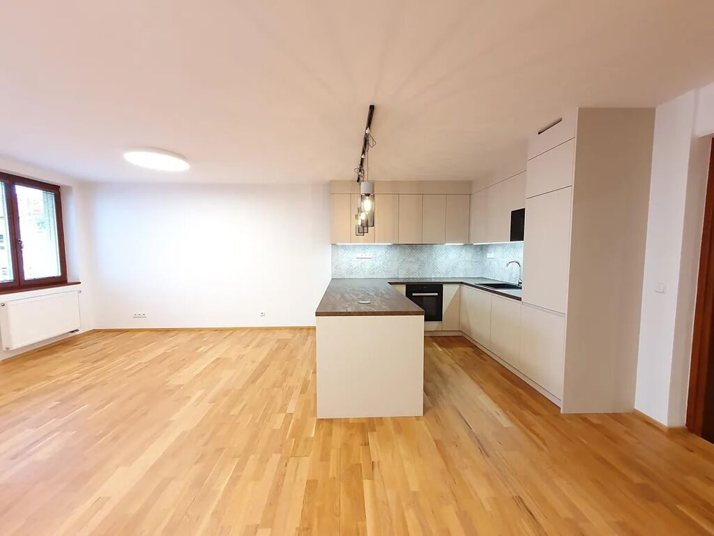 obývací pokoj s plně vybavenou novou moderní kuchyňskou linkou s myčkou a lednicí s mrazákem,