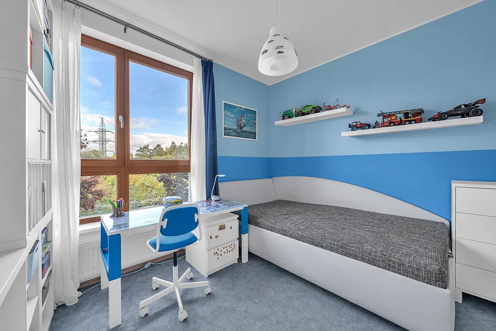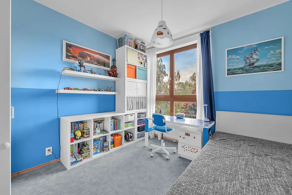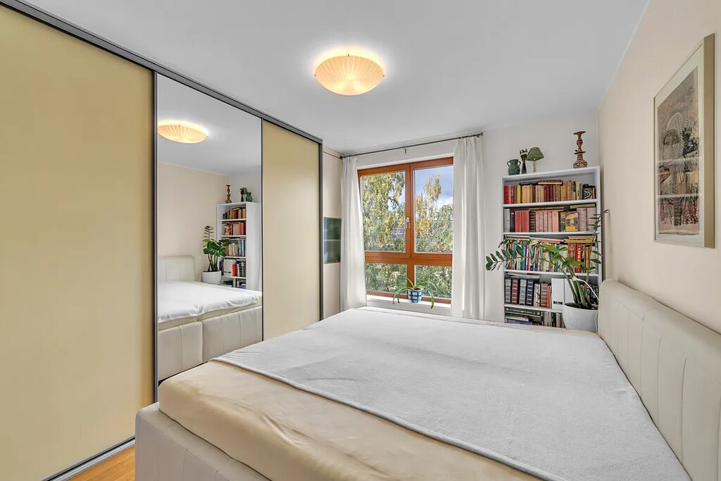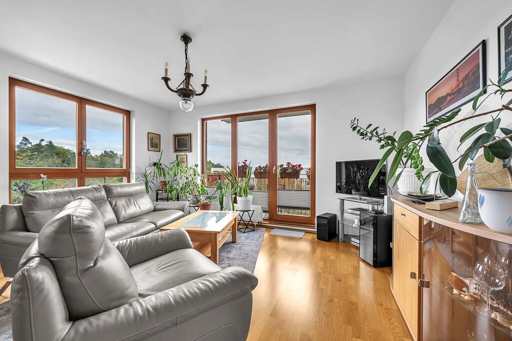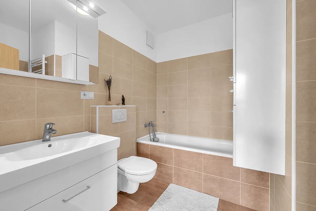 Interiér bytu je navržen v minimalistickém stylu s důrazem na světlo, prostor a funkčnost. Obývací pokoj s kuchyňským koutem je propojen s balkonem, který nabízí příjemné posezení s výhledem do zeleně i na město. Kuchyně je vybavena moderními vestavěnými spotřebiči a výrazným barevným obkladem. Ložnice i další pokoj jsou světlé, s dostatkem úložného prostoru. V bytě se nachází dvě koupelny – jedna s vanou, druhá se sprchovým koutem, což výrazně zvyšuje komfort pro rodinu i návštěvy. V předsíni se nachází vestavěné skříně a zrcadlové dveře, které opticky zvětšují prostor.