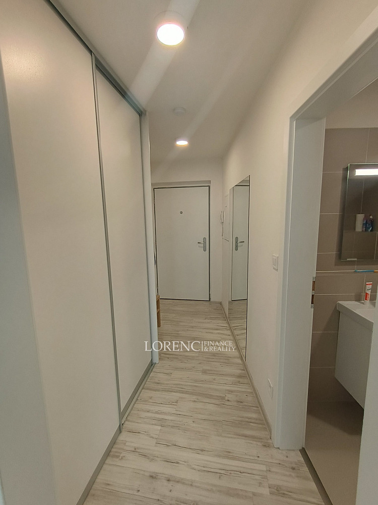 Byt 2kk má velikost 42,6 m² a balkon o rozloze 3 m². Byt je vybaven na chodbě vestavěnou skříní, věšákem, botníkem a velkým zrcadlem. V obývacím pokoji kompletně novou kuchyňskou linkou (spotřebiče - myčka, lednice s mrazákem, mikrovlnná trouba, trouba, sklokeramická deska) a stolem. Obývací pokoj nabízí variabilní uspořádání na obě strany - jsou datové i televizní zásuvky.
