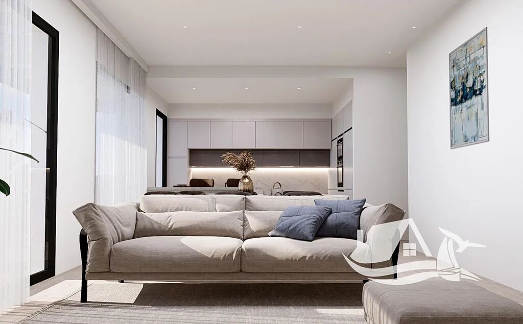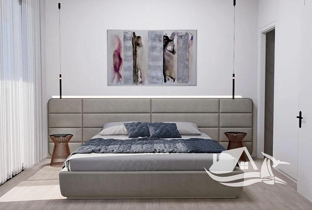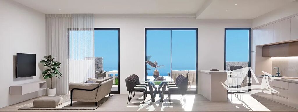 Prostorný apartmán o dispozici 4+kk a celkové ploše 96 m² doplňuje terasa o velikosti 131 m², ze které se otevírá výhled na moře. K bytu patří dvě koupelny, soukromé parkovací místo a možnost využívat společný bazén obklopený upravenou zahradou. Díky proskleným plochám je interiér plný světla a propojuje se s venkovním prostorem, který zve k relaxaci i posezení s přáteli.