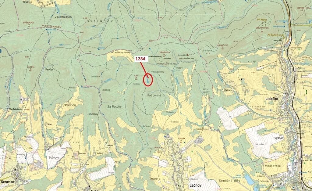 Lesní pozemek o výměře 3805 m2, parcelní číslo 1284, podíl 1/1, katastrální území Lačnov, obec Lačnov, obec s rozšířenou působností Vsetín, okres Vsetín, Zlínský kraj.