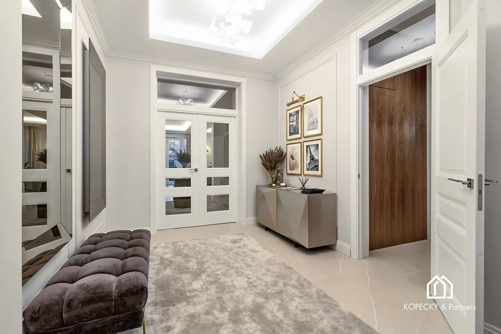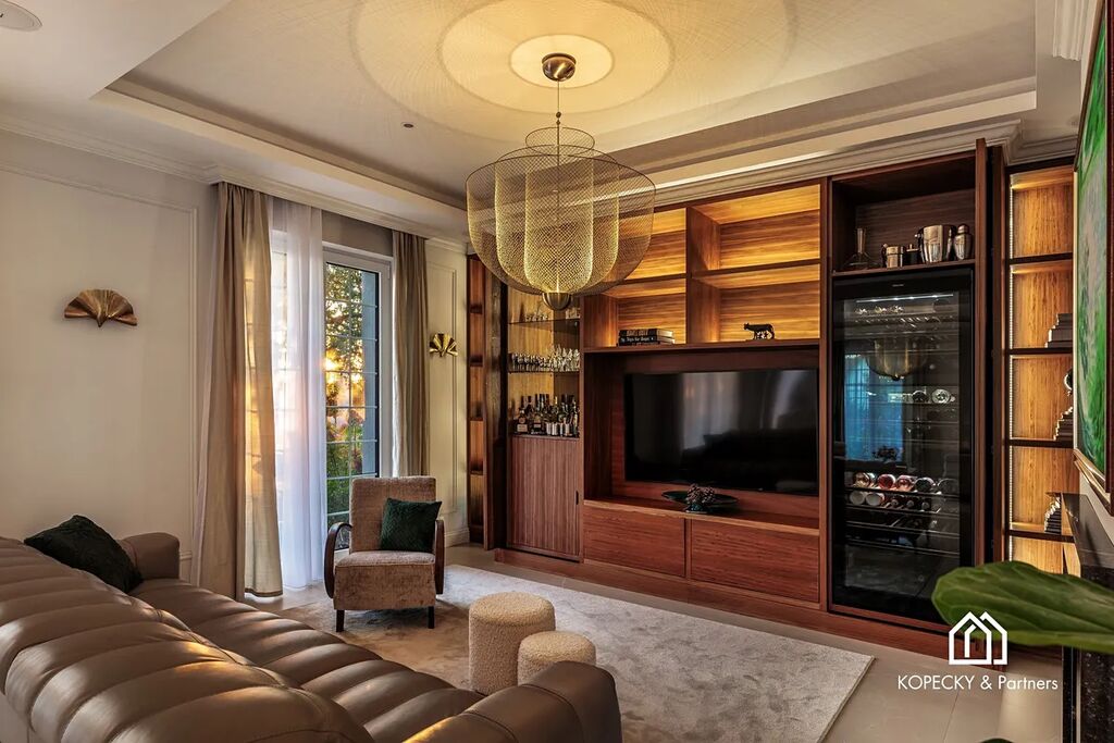 Celý dům je zařízen v duchu sofistikované elegance – od ikonických svítidel navržených Zahou Hadid, přes jídelní stůl Bonaldo pro deset hostů, až po nábytek a osvětlení od značek Eichholz, Moooi či Cattelan Italia. Každý detail byl pečlivě vybrán tak, aby tvořil harmonický celek.