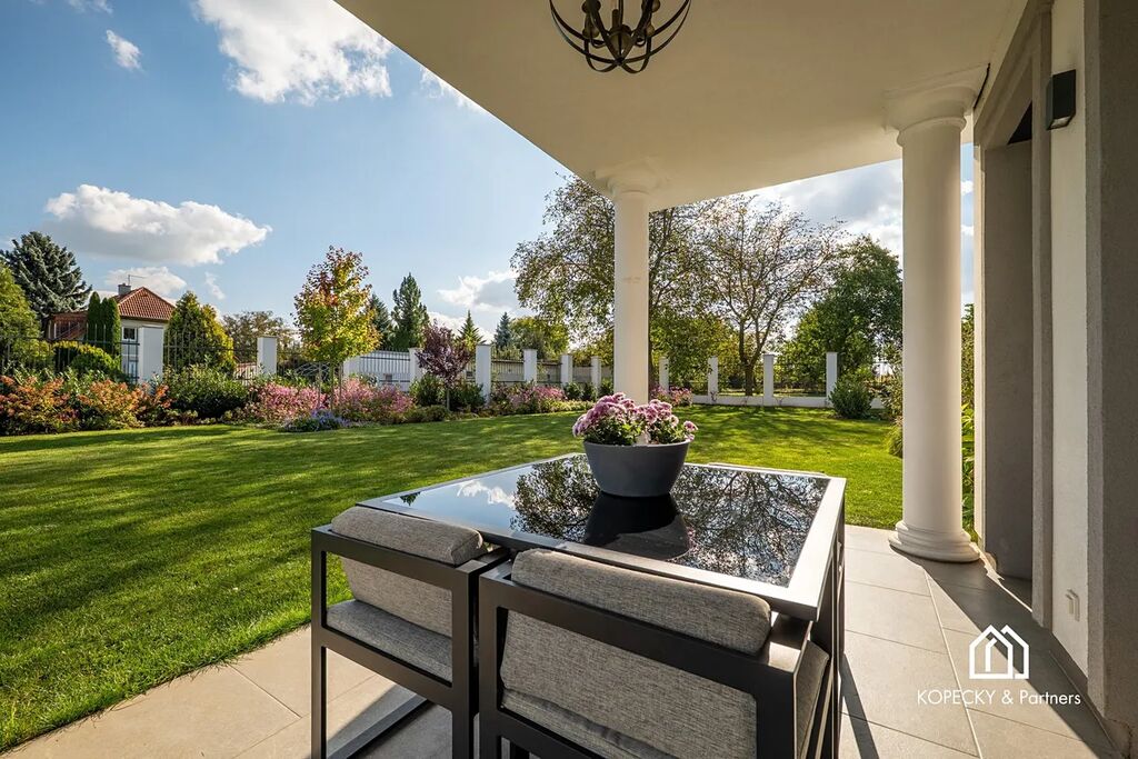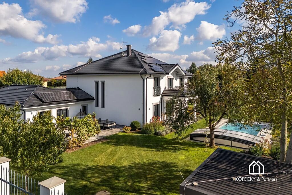 Na profesionálně udržované zahradě najdete zastřešený bazén 8×4 m se slanou vodou, zavlažovací systém, vrtanou studnu a zahradní domek. Parkování je zajištěno v dvojgaráži a na dalších plochách až pro 7 automobilů, včetně přípravy na dobíjení elektromobilů.
