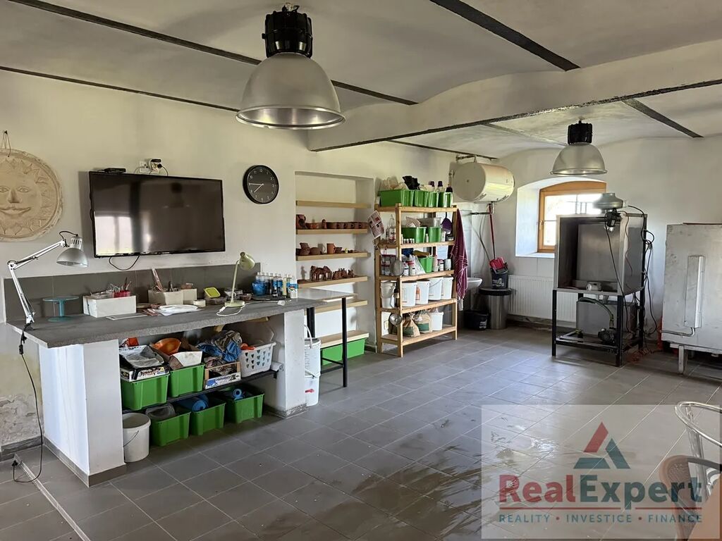 Vedlejší patrová stavba (30 × 10 m, užitná plocha cca 500 m2) má v přízemí technické zázemí, dílny, garáže a sklad. V patře jsou tři apartmány (3+kk, 2+kk, Atelier).
