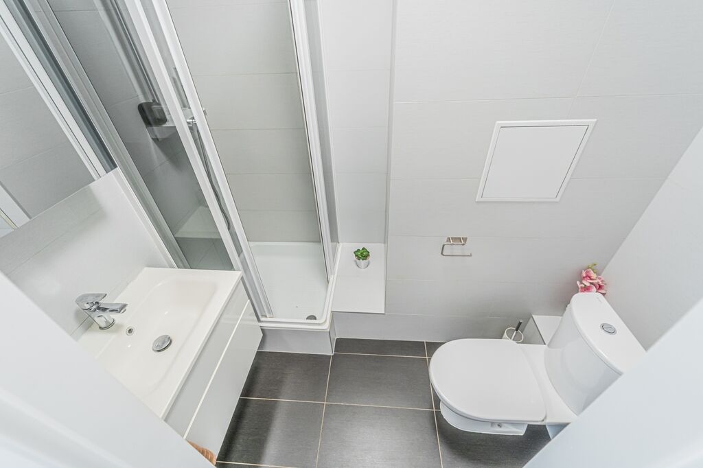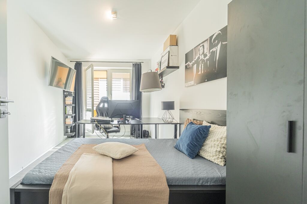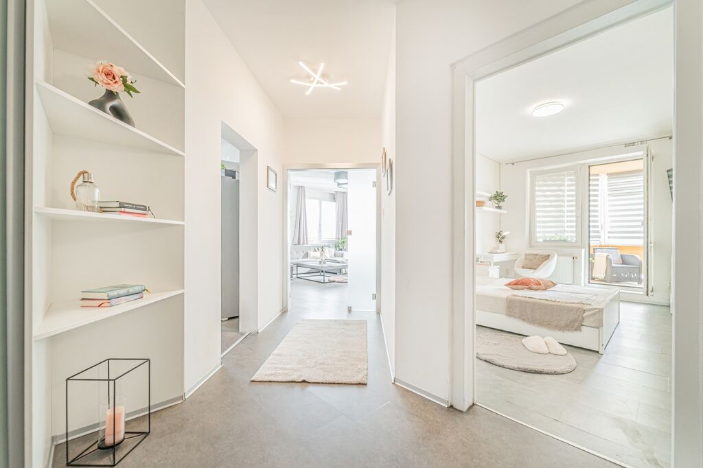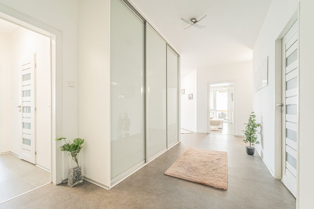 Srdcem bytu je krásný, prostorný a světlý obývací pokoj, propojený s novou kuchyní, kde je dostatek místa i pro jídelní stůl. Dvě ložnice budou určitě velmi dobře sloužit mladším členům rodiny. Ze všech zmiňovaných místností je vstup na hezkou, zasklenou lodžii. Ta může díky své výměře převážnou část roku sloužit jako další obytná místnost. Velkým bonusem je ještě jedna ložnice s vlastní toaletou a koupelnou, kde mohou například rodiče mít maximální klid a soukromí. Pro další členy rodiny je k dispozici hlavní koupelna s WC a bidetem. Velkou výhodou je dostatečně velká hala, kde máte dost místa na velkou šatní skříň. Dalším praktickým doplňkem je i komora na všechny věci, které chcete mít po ruce, ale nemusí být vidět.