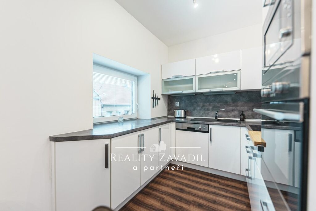 Disponuje prostornou chodbou, ze které je vstup do kuchyně s velkým jídelním stolem a vestavěnou skříní, která zajistí dostatek úložného prostoru.