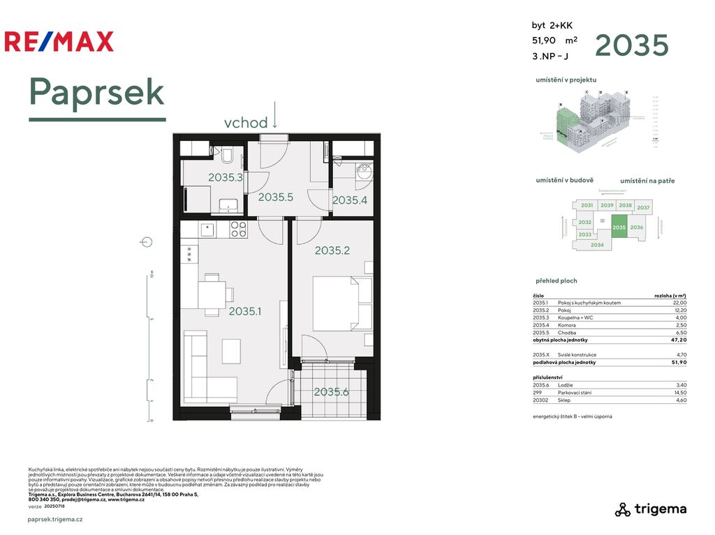 Vstup na lodžii o velikosti 3,4 m² je možný jak z ložnice, tak z obývacího pokoje. K bytu náleží sklepní kóje (4,6 m²) a garážové parkovací stání.