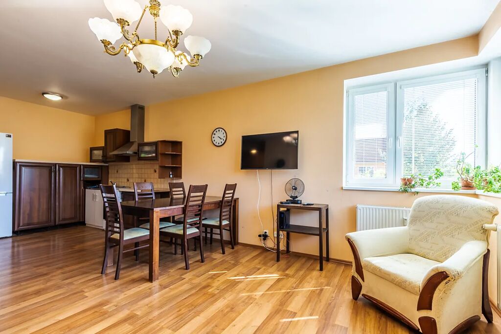 Byt je světlý, vzdušný a nabízí pohled do okolní zeleň ze všech svých místností.