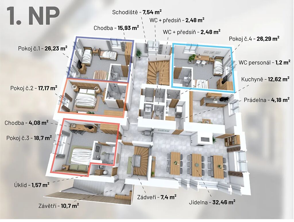 Vila Vivenot stojí na ohraničeném pozemku velkém 2749 metrů čtverečních. Zahradu lemuje Bělokamenný potok a najdete tady dokonalé a ničím nerušené soukromí, třeba na terase, u ohniště, na dětském hřišti nebo v sauně. Ve vile jsou čtyři pokoje a dva apartmány, celkem zde ubytujete 20 osob a nechybí zde ani zázemí pro nejmenší.Pokoje i apartmány jsou protorné viz. půdorysy. Pokoje v přízemí mají společnou kuchyň a společenskou místnost s krbem a výhledem, který se vám neomrzí. Celoročně je tady útulno a domácí atmosféru si můžete zpříjemnit třeba zatopením v krbu. Posedět můžete na terase, v zahradě nebo třeba u potoka. A přímo ze sauny můžete pro osvěžení do potoka nebo se v zimě otužit v čistém sněhu. Po celý rok tady vy i vaši návštěvníci najdete spoustu vyžití a proto v domě nechybí lyžárna ani kolárna.