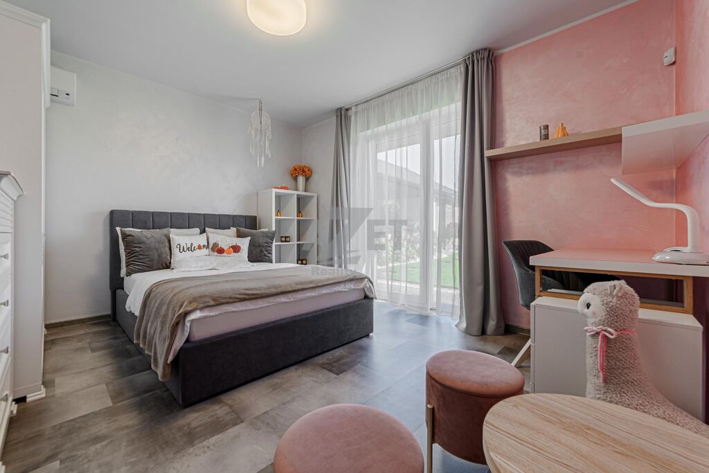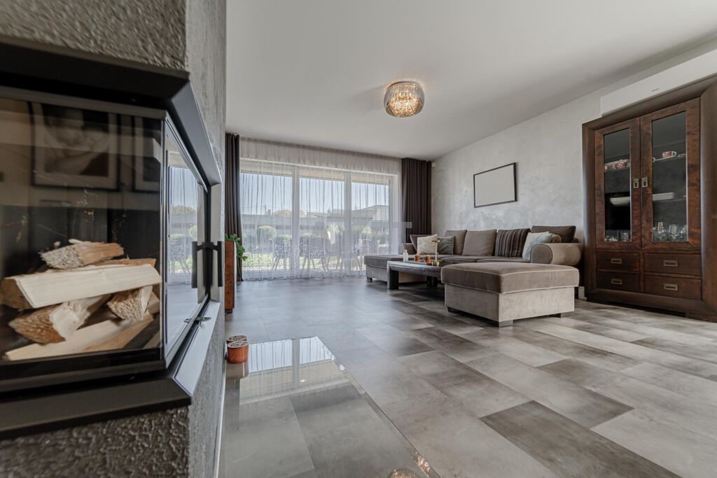 1. NP - V kuchyni otevřené do hlavní obytné místnosti se nachází moderní rohová kuchyňská linka ve tvaru U vyrobená řemeslně na míru, v provedení bílo-šedá, vybavená kvalitními spotřebiči (myčka, lednice, horkovzdušná trouba, sklokeramická varná deska, digestoř). Dominantou obývacího prostoru je krb, který zajišťuje příjemnou atmosféru i tepelný komfort v chladnějších měsících. Z obývací místnosti je přímý vstup na dlážděnou terasu (betonová dlažba) s posezením a výsuvnou pergolou. Z dalších pokojů je vstup přímo na zahradu.