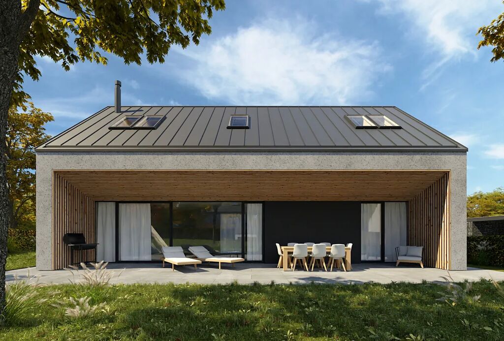 Hlavní obytná část je orientována do zahrady, kde se nachází krytá terasa s posezením, ideální pro relaxaci nebo setkávání s rodinou a přáteli. Velké prosklené plochy propojují interiér s exteriérem a vytvářejí příjemný, vzdušný prostor.